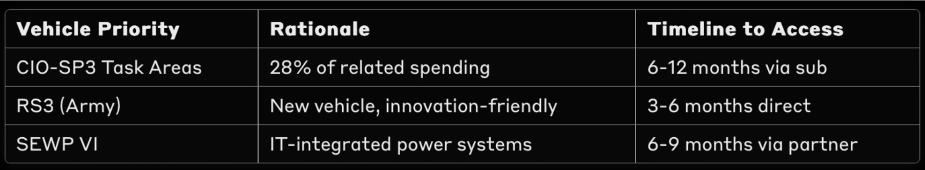 Prime Subcontracts: Generate immediate revenue while building past performance—target portfolio companies (Anduril, Shield AI) needing integrated power
