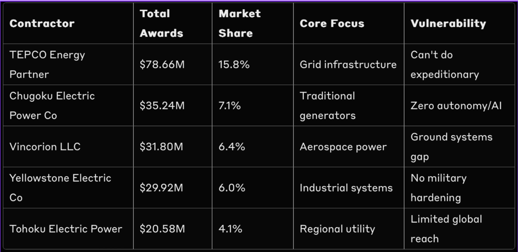 Competition Reality Check: Top recipients include TEPCO Energy Partner ($78.66M), Chugoku Electric ($35.24M), and Vincorion ($31.80M)—all selling yesterday's diesel technology. They're optimized for megawatt installations, not distributed kilowatt nodes.
