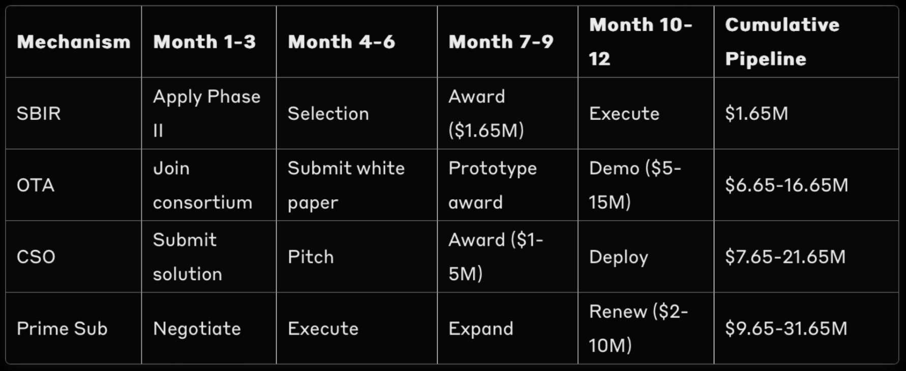 Why This Matters: Traditional federal playbooks create 3-5 year paths to meaningful revenue. Chariot's parallel approach compresses this to 12-18 months by working multiple angles simultaneously. Failed bids become learning experiences that improve win rates. Early smaller wins provide credibility for larger pursuits. The cumulative pipeline de-risks the business for investors while demonstrating momentum.