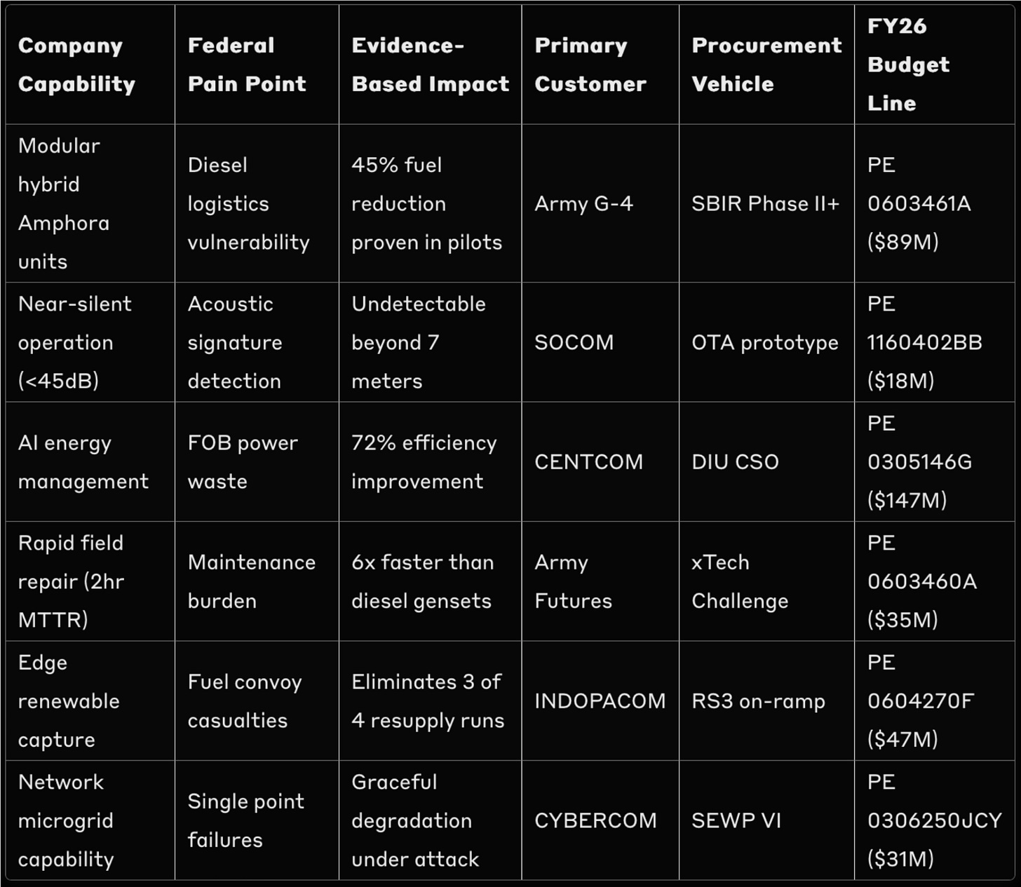 The 93% DoD concentration seems limiting until you realize the opportunity: civilian agencies desperately need resilient power (FEMA, State Department embassies, USAID forward operations) but lack specialized vendors.