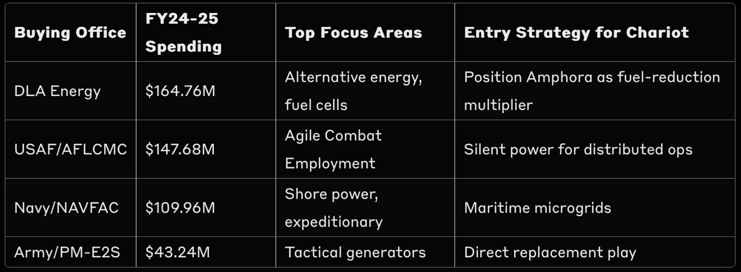 Primary takeaway: Traditional power contractors locked into diesel gensets while DoD desperately needs silent, modular, AI-managed energy—creating unprecedented entry space for hybrid platforms like Chariot's Amphora