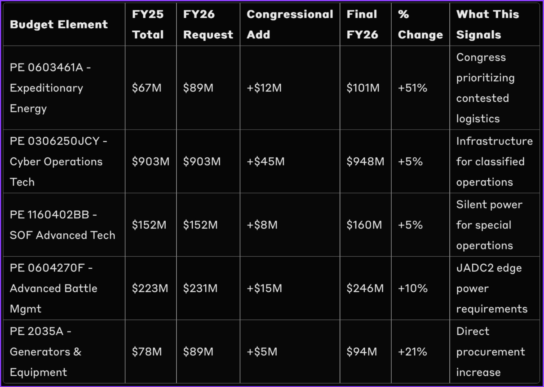 📈 Appropriations Intelligence: The 51% increase in expeditionary energy didn't emerge from Service requests—it's a Congressional add driven by combatant commander unfunded priority lists. Translation: operators desperately want this capability and went around bureaucracy to get it.