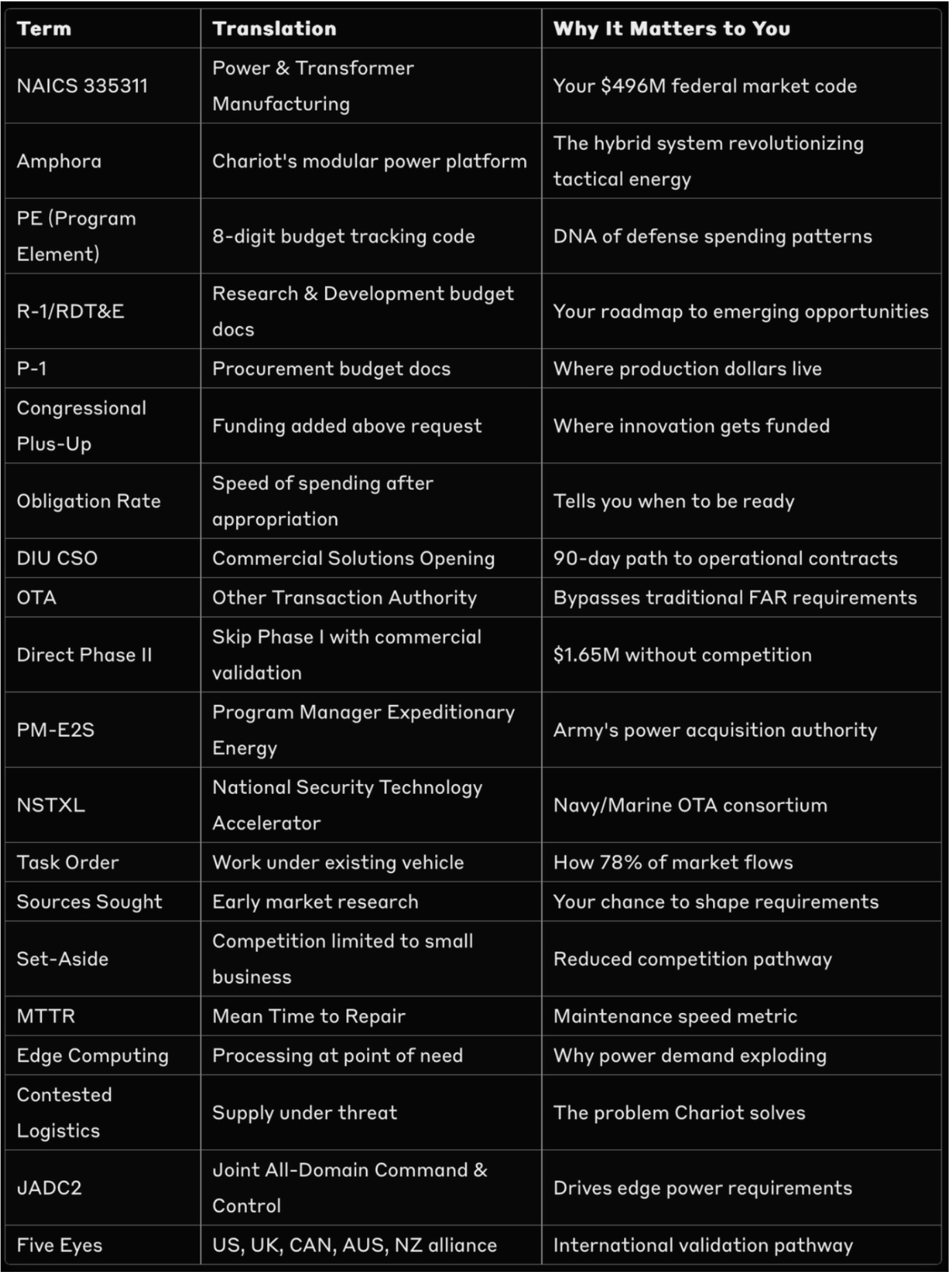 Why This Matters: The convergence of budget increases, explicit requirements for Chariot's capabilities, and congressional mandates creates a generational opportunity. Traditional contractors can't pivot their diesel-centric business models fast enough. While they protect yesterday's revenue, an entirely new market for intelligent, hybrid power systems emerges. The window for establishing category leadership in expeditionary microgrids closes within 18-24 months.