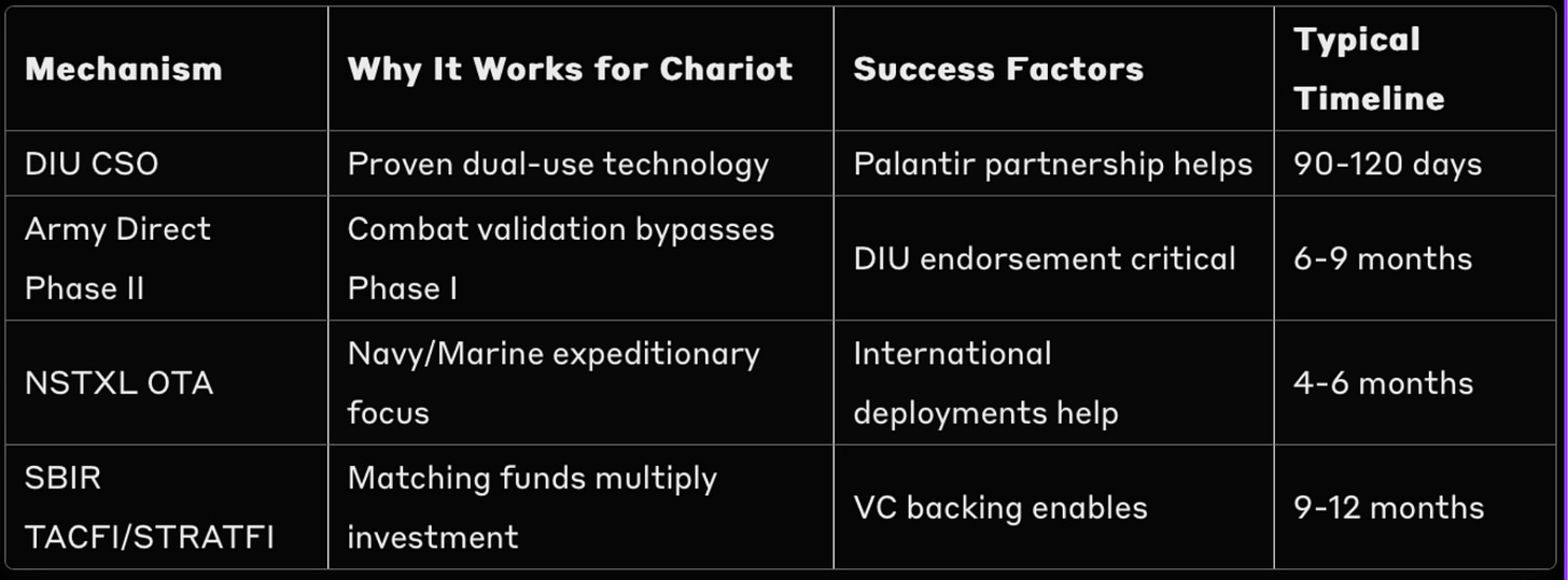 Why This Matters: Federal success requires matching company maturity to appropriate mechanisms. Chariot's unique position—venture funding plus combat validation—enables them to skip traditional progression steps. While competitors spend 18 months in Phase I purgatory, Chariot can pursue operational contracts immediately.