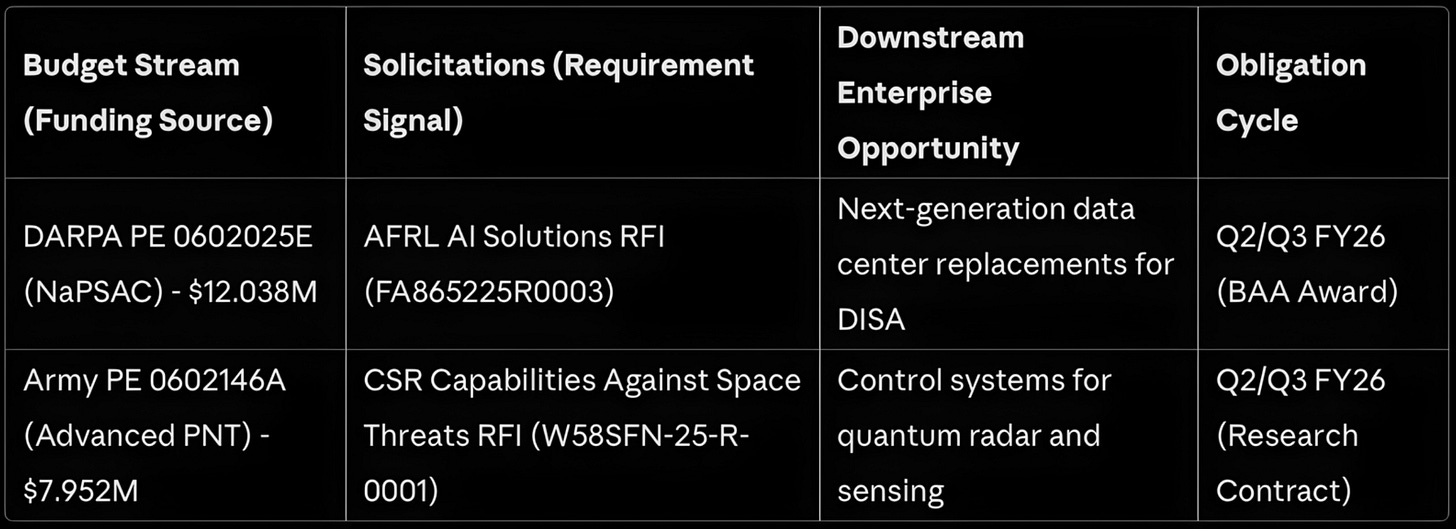 Congressional & Policy Tailwinds: Congressional focus on beyond-CMOS technologies (CHIPS Act) and Quantum Centers of Excellence ensures that highly-aligned funding streams like NaPSAC (PE 0602025E) and Quantum PNT (PE 0602146A) are protected and mandated