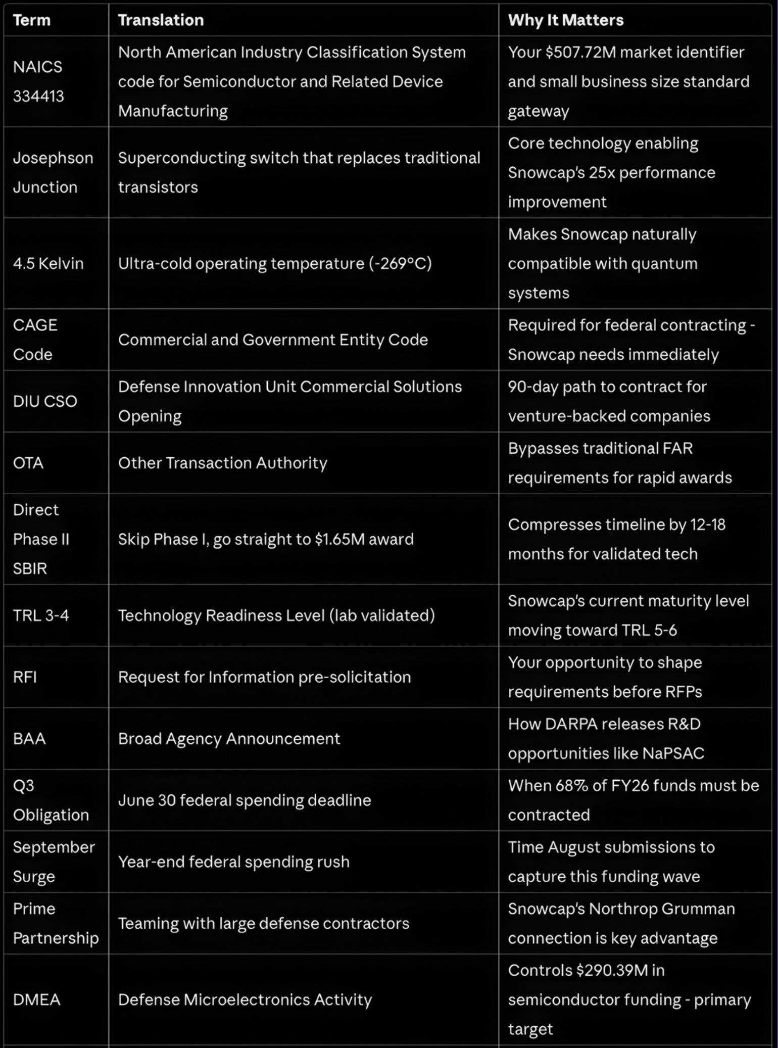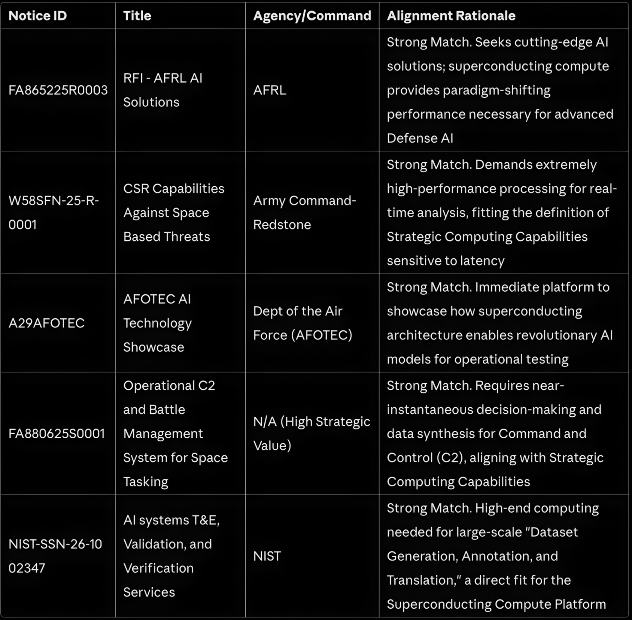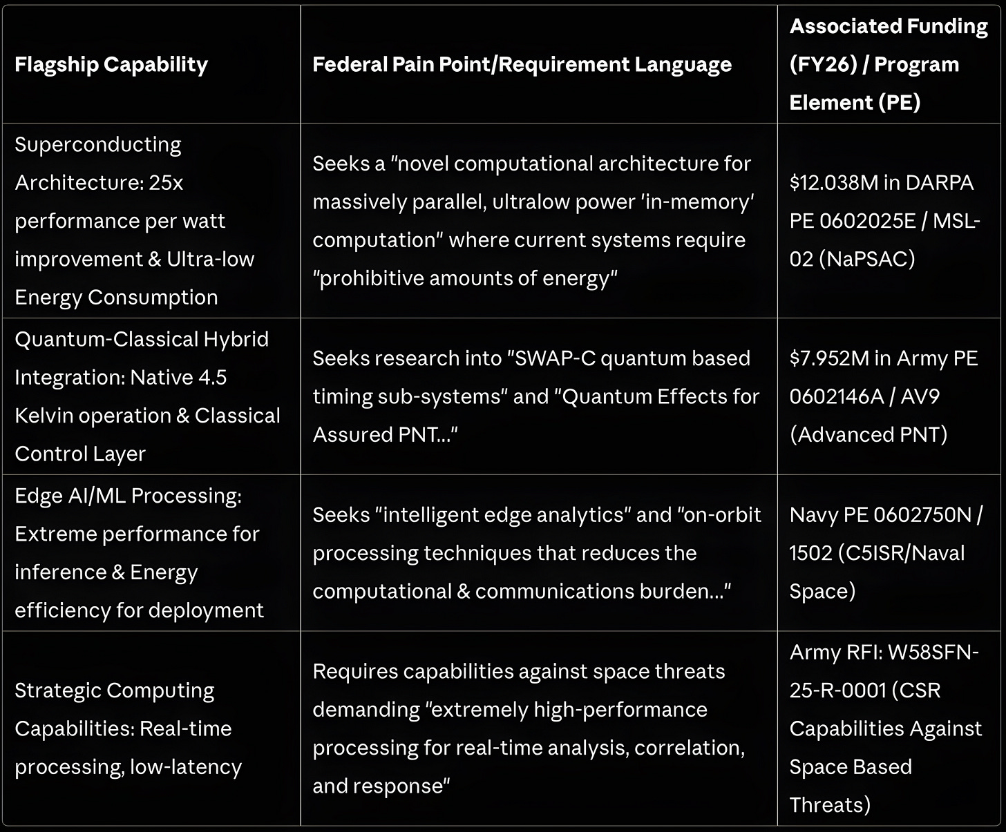 Opportunities Uncovered: $19.99M in perfectly aligned FY26 RDT&E funding (DARPA NaPSAC and Army Quantum PNT), DIU Commercial Solutions Opening pathway for 90-day contract awards, immediate prime partnership opportunities with Northrop Grumman (foundersâ connection), and first-mover advantage in commercial superconducting compute using standard 300mm fabrication.