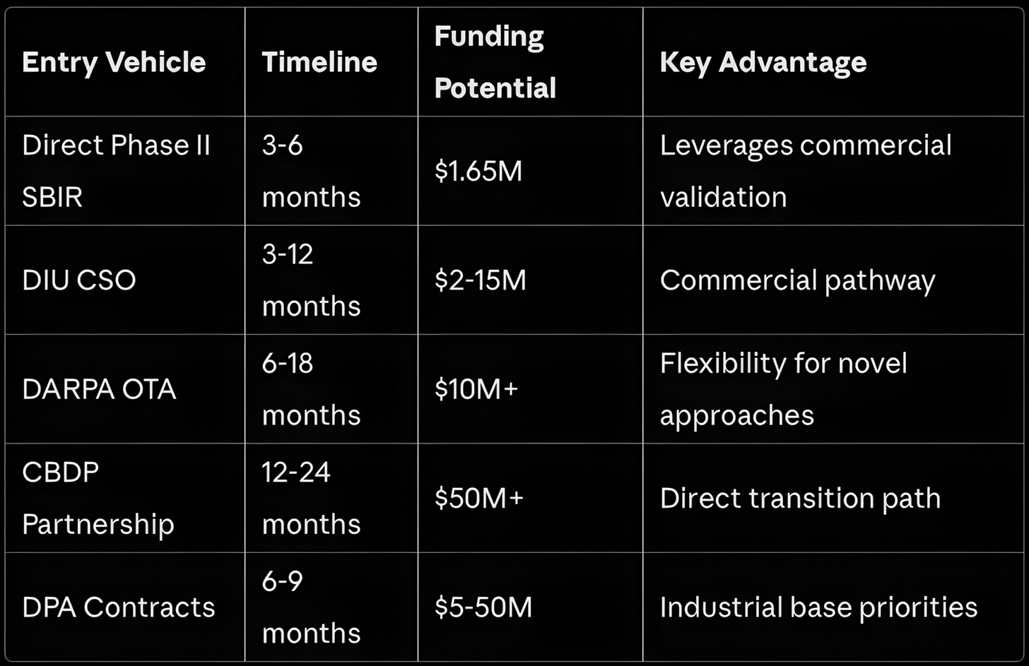 Utilize Rapid Vehicles: Apply for the DIU Commercial Solutions Opening (CSO) and AFWERX SBIR Open Topic to compress the federal revenue cycle