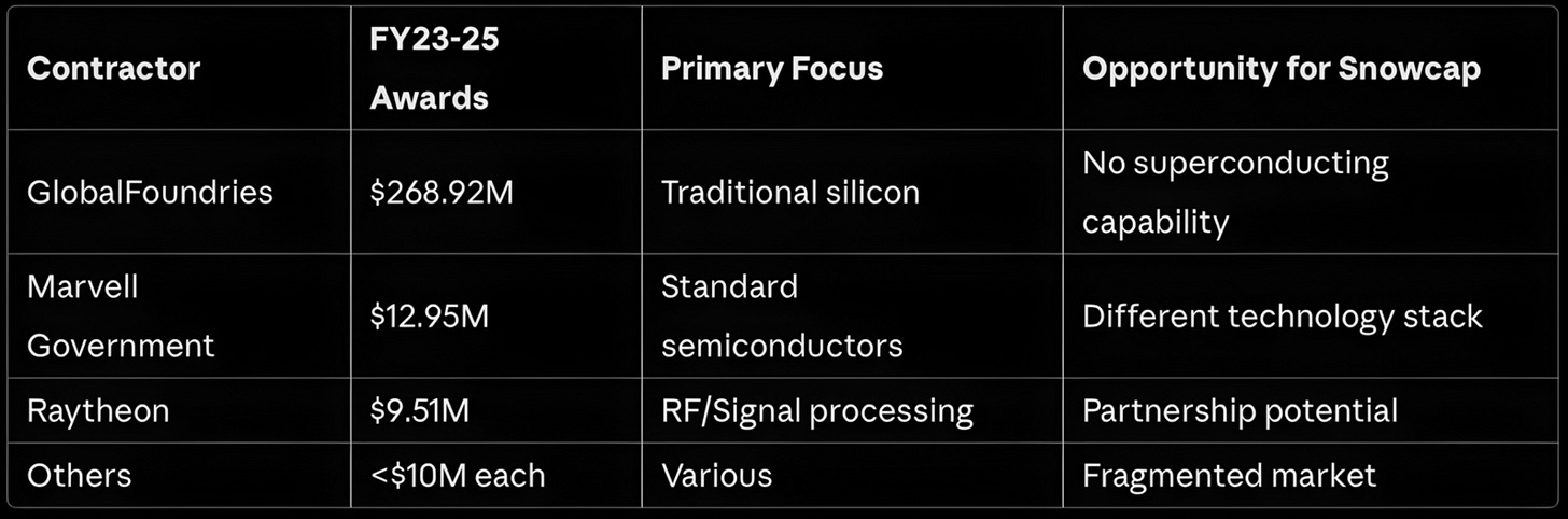 Snowcap holds a critical first-mover advantage in the commercialization of superconducting compute using standard fabrication processes (300mm fabs). The competitive landscape is defined by a massive gap: direct competitors are primarily research arms (IMEC, IBM Research focused on quantum) or utilize older technology (Hypres Inc.). This structural market gap ensures that Snowcap is uniquely positioned to partner with established Primes, such as Northrop Grumman (natural connection through founders), Lockheed Martin (quantum alignment), and Raytheon (signal processing).