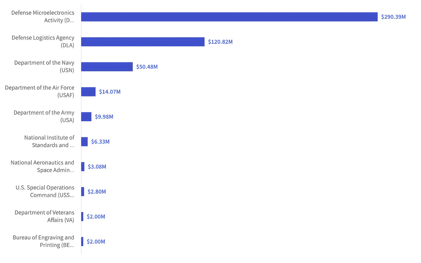 Anchor Code: NAICS 334413 - Semiconductor and Related Device Manufacturing. With $507.72M in federal semiconductor awards (FY23-25) and key opportunities under related PSCs, this sector is experiencing unprecedented investment in beyond-CMOS technologies. The concentration of funding in Defense Microelectronics Activity ($290.39M) signals urgent operational need for revolutionary compute architectures.