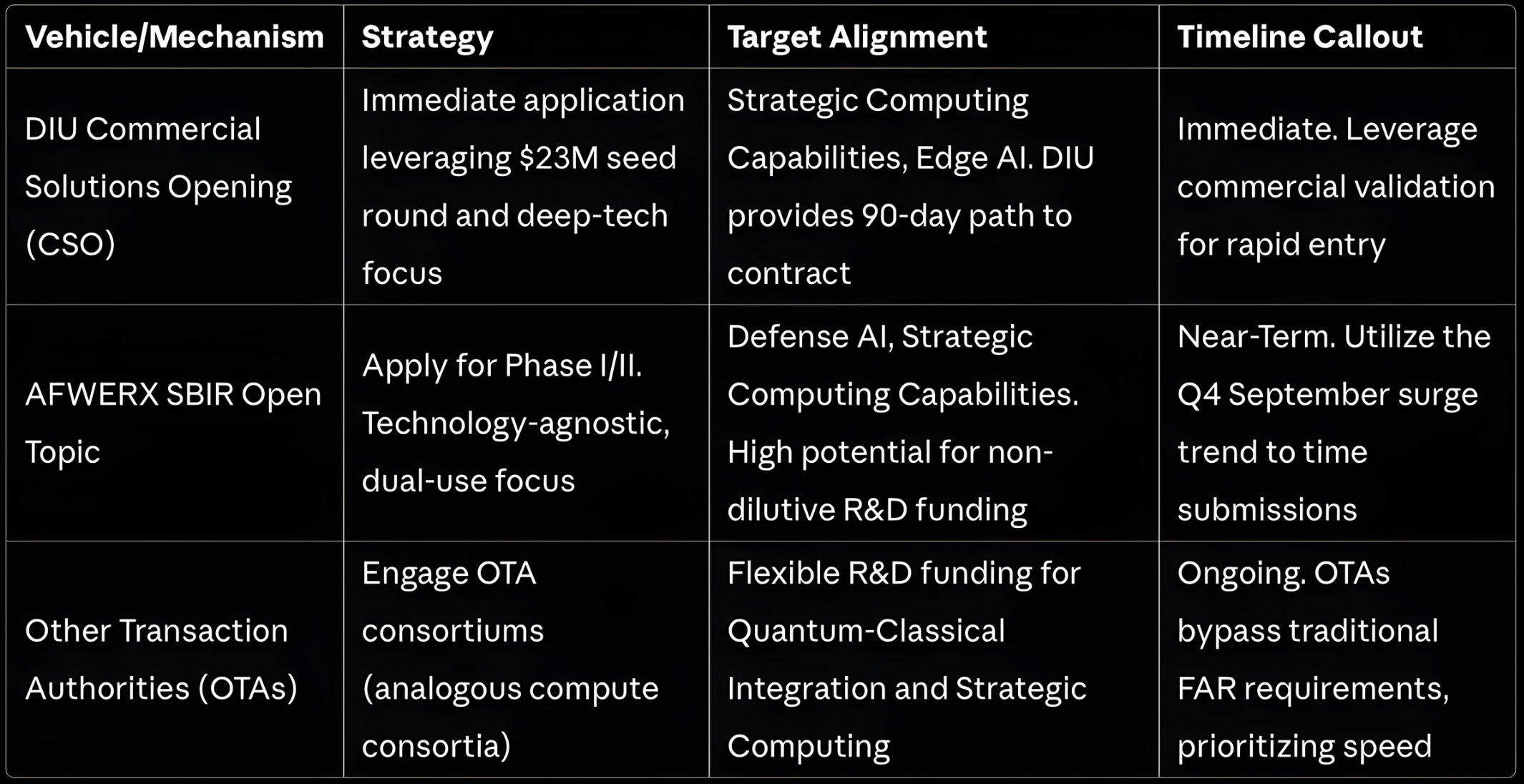 To capture the emerging federal market for superconducting compute, Snowcap must pursue a strategy of parallel execution, simultaneously leveraging direct R&D funding, strategic prime partnerships, and rapid acquisition vehicles. This roadmap focuses on compressing the typical 3-5 year federal revenue timeline to 12-18 months by targeting programs that explicitly fund ultra-low power and quantum-compatible architectures.