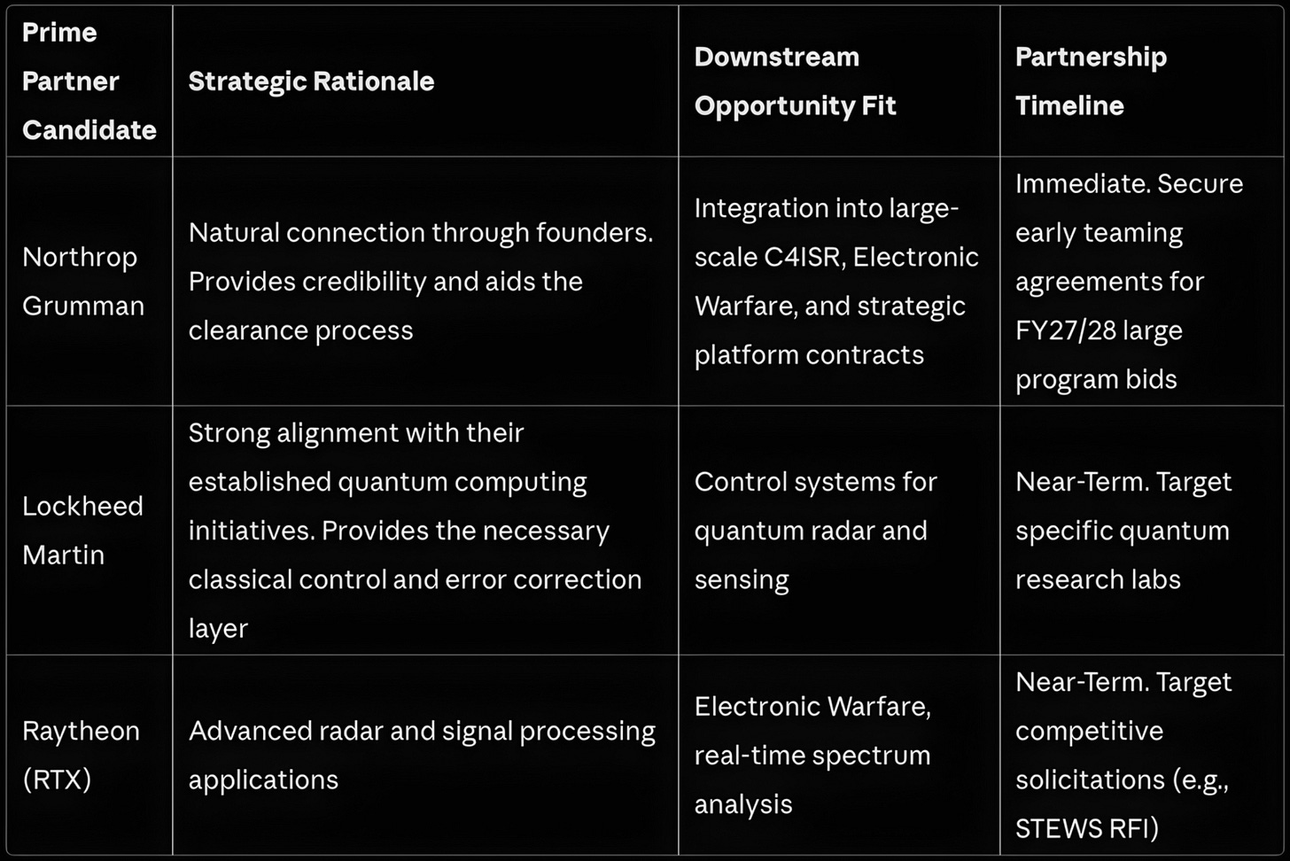 Prime Partner Candidates: Given the CSO (Dr. Anna Herr) and CTO (Dr. Quentin Herr) are former Northrop Grumman Fellows, Northrop Grumman is the natural primary partner candidate for subcontracting and technology integration. Lockheed Martin (quantum alignment) and Raytheon (signal processing) are also strategic targets
