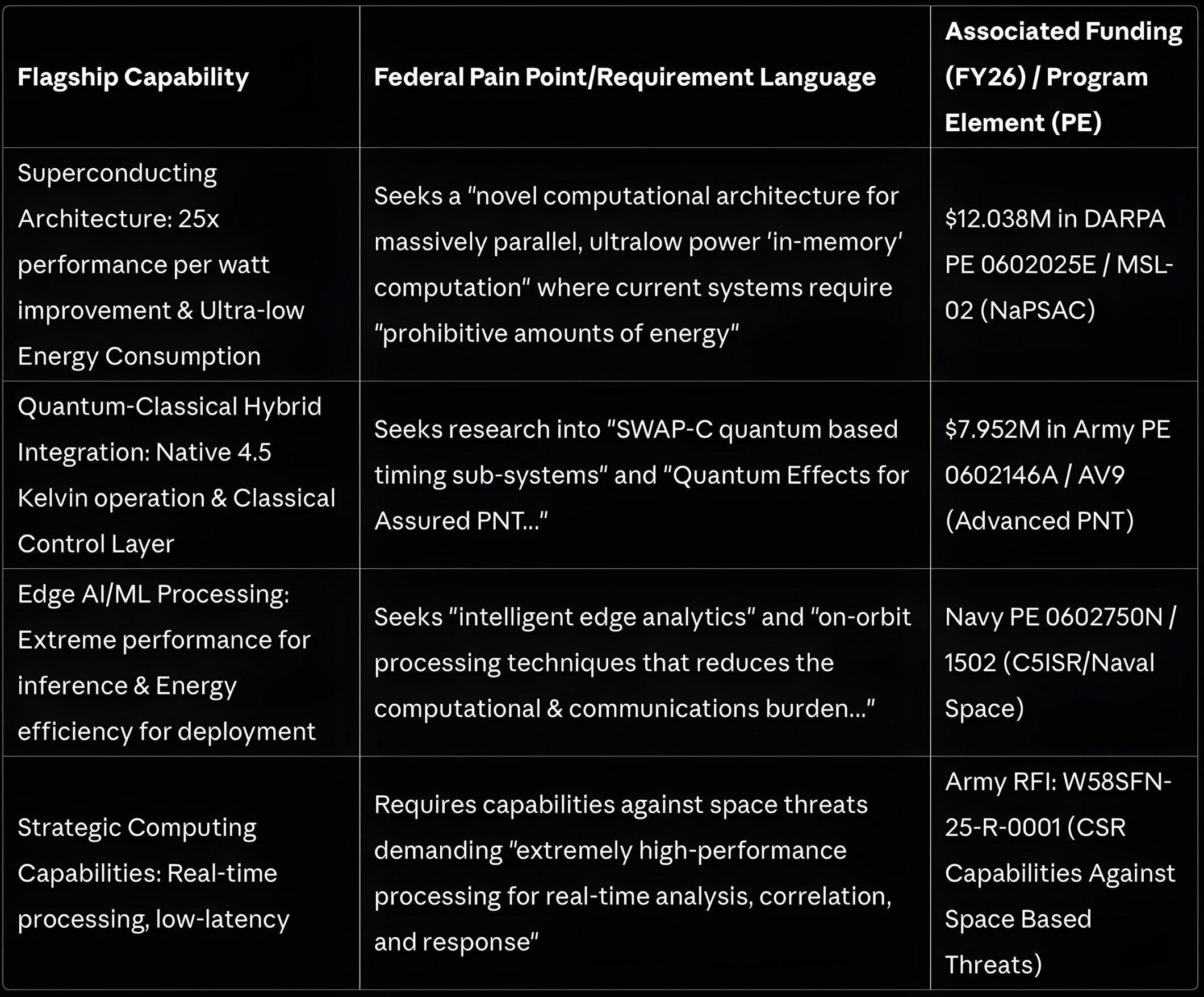 Why This Matters: The concentration of highly relevant R&D funding in specific Program Elements across DARPA, Army, and Navy validates that superconducting compute is shifting from a scientific novelty to an operational necessity. The explicit requirement for âultralow powerâ computation and the demand for platforms compatible with cryogenic/quantum environments means Snowcap Computeâs technology is not merely an alternative, but a solution to an approaching physical crisis in defense computing. This market intelligence provides geographic and opportunity recognition by pinpointing which program offices (DARPA/MTO, Army/ARL) and mission areas (Advanced PNT, Edge AI) have immediate, dedicated capital.