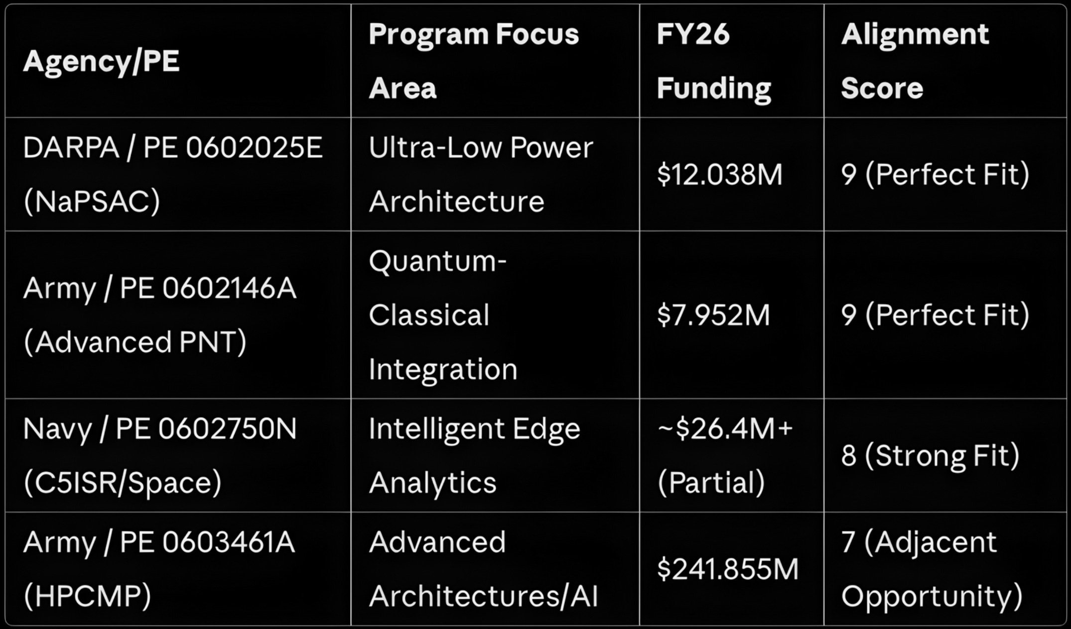 Analysis of the FY26 budget and active solicitations confirms an immediate, dedicated funding demand signal. Snowcapâs capabilities are an aligned fit for two critical, funded Program Elements (PEs): DARPAâs NaPSAC program (PE 0602025E - $12.038M), which seeks âultralow powerâ architectures, and the Armyâs Quantum PNT effort (PE 0602146A - $7.952M), which requires classical control layers for cryogenic quantum systems.