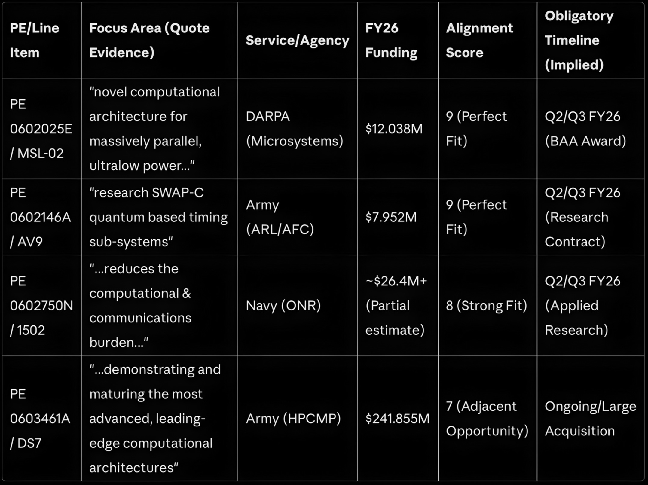 Analysis of the FY26 DoW Budget Justification documents reveals a conservative estimate of over $46.4 million in immediate, high-priority Research, Development, Test, and Evaluation (RDT&E) funding that perfectly aligns with Snowcap Computeâs core capabilities (Score 8/9 matches).